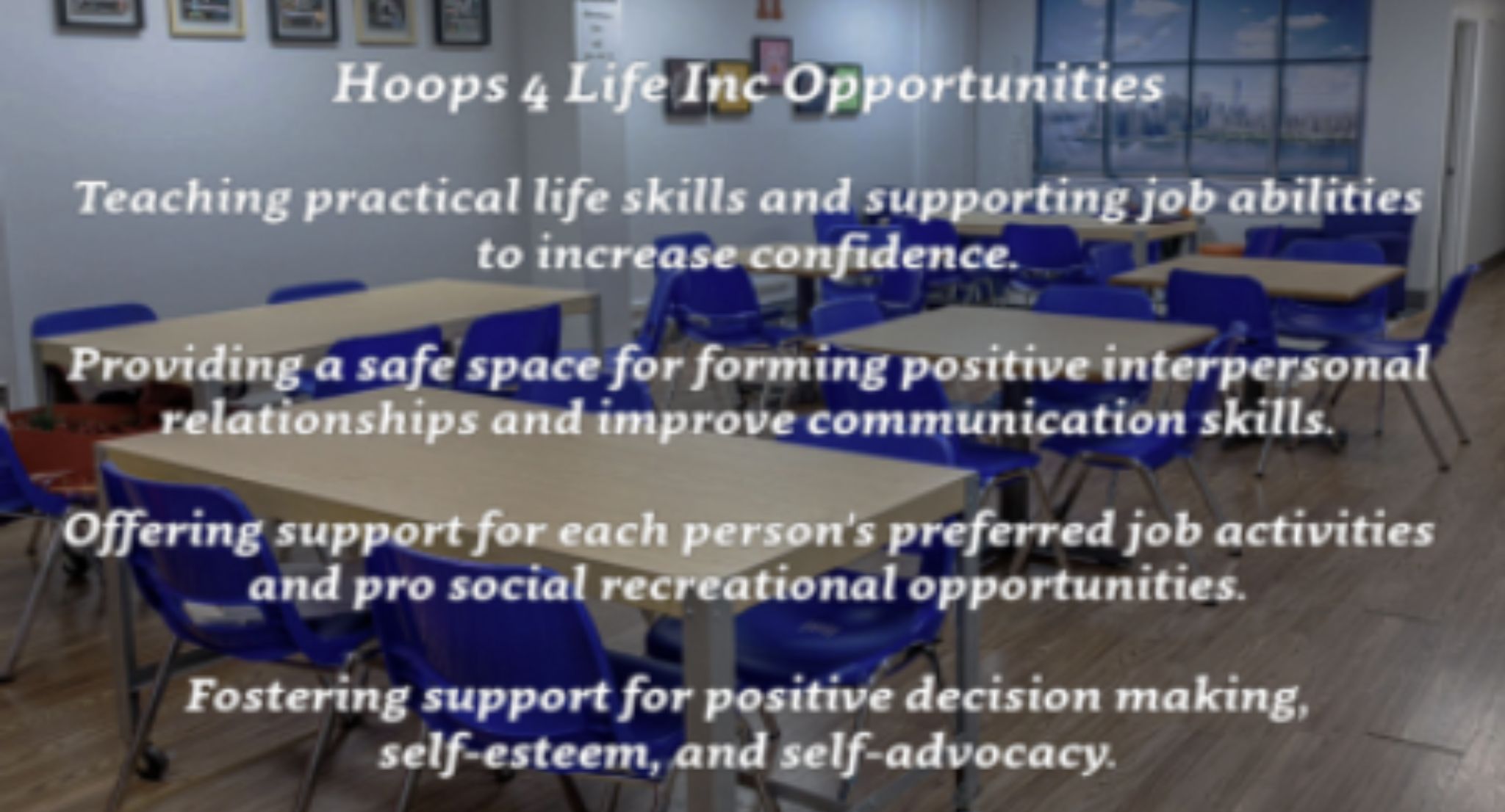 The mission of Hoops 4 Life Inc. is to deliver compassionate, high-quality services for individuals with developmental needs. We strive to enhance their life experiences and create greater opportunities by supporting participation in meaningful community-based work, social, and recreational activities.